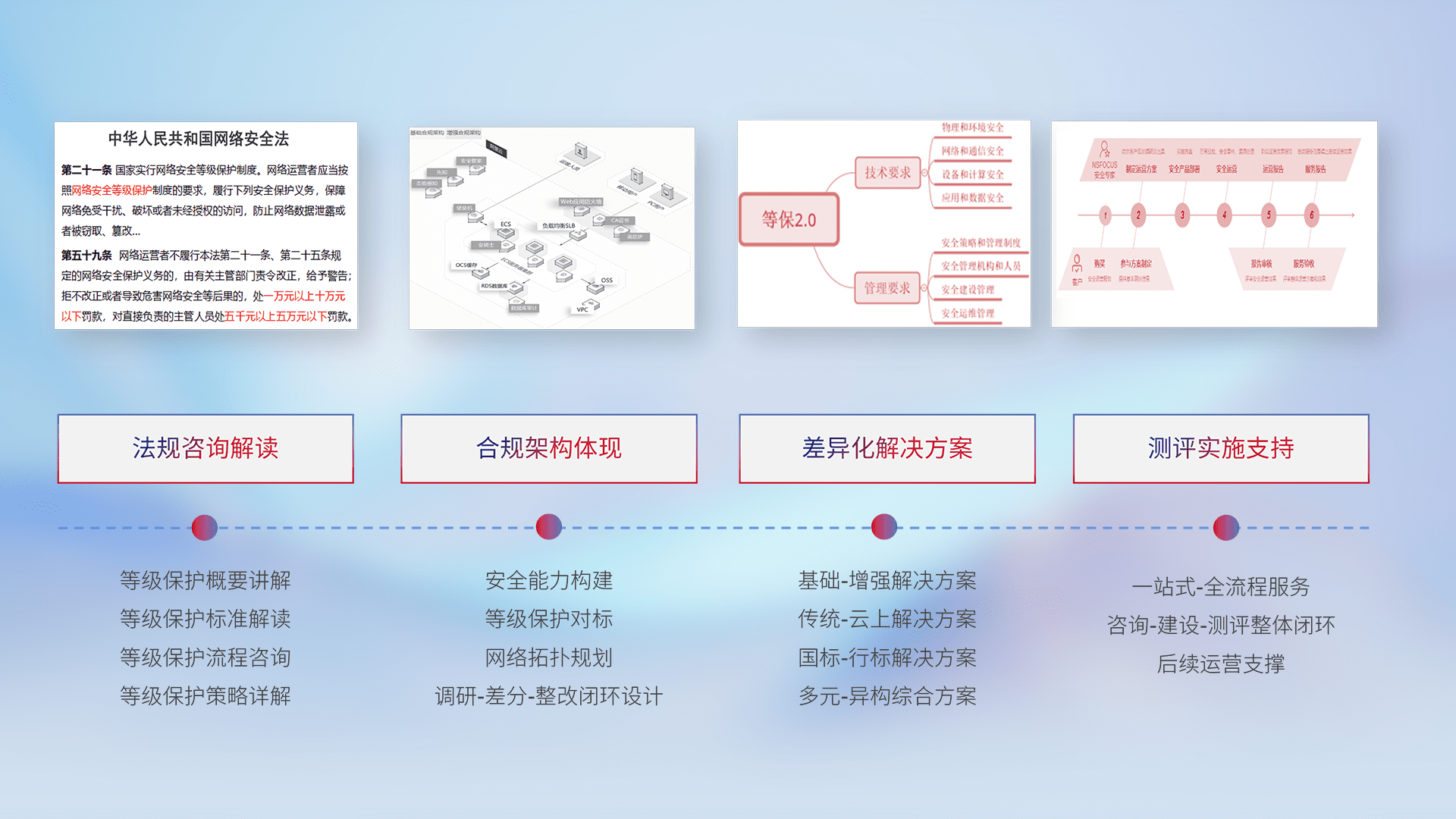 通过专业的法律咨询解读、、、、合规架构体现、、、差异化解决方案、、、测试实施支持等服务,,为客户量身打造等保合规体系。。